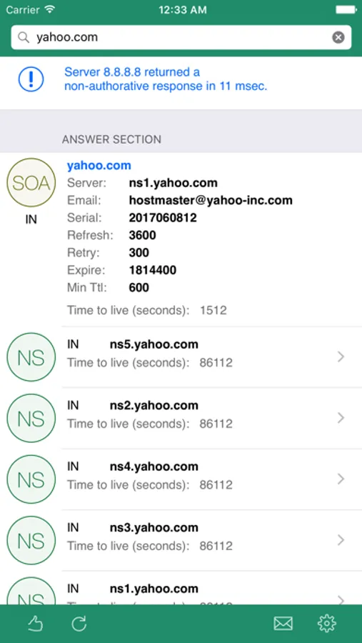 NSLookup for iPhone and iPad allows you to see the public DNS records of domains or sub domains. Then you may also query the NS and CNAME records. It's also possible to force it to get an authoritative response from main DNS server of the domain.
