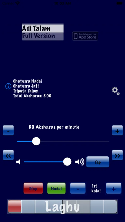 Experience some of the awesome features of the Talanome App with this "lite" (but still feature-full) version that brings you the ability to play the most common Carnatic Talam, Adi Talam, without any ads, restrictions or restraints in this FREE version! Upgrade to the full version to unlock the myriad other options and features!