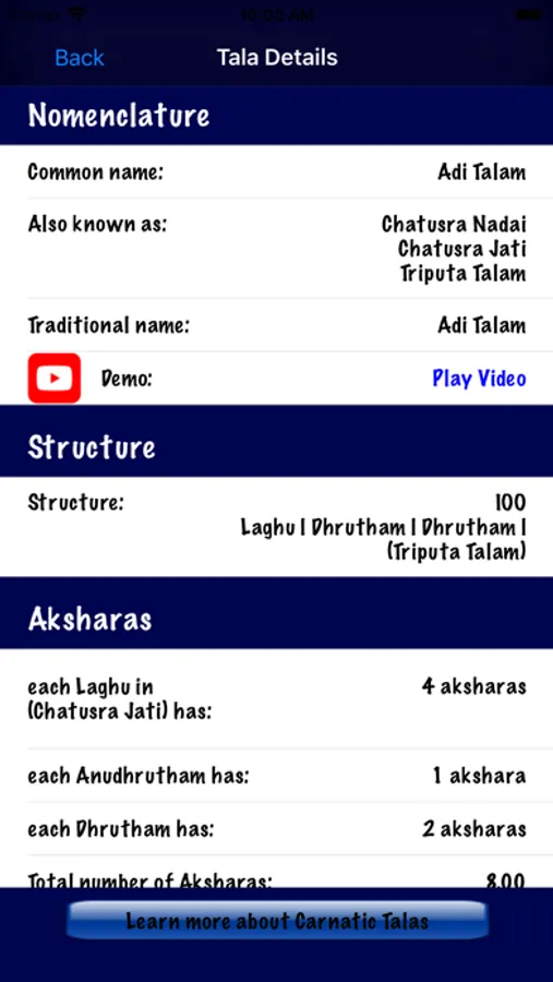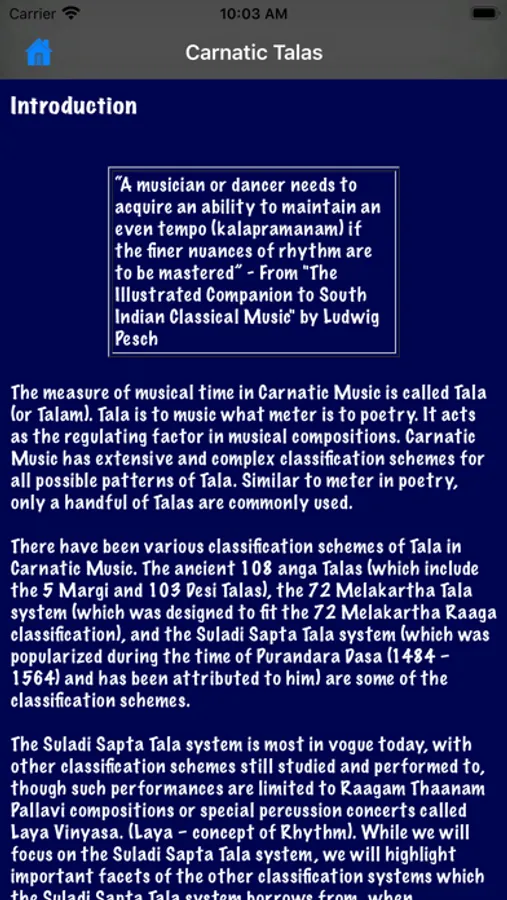* A unique visual representation of the tala using animation to facilitate following along with the beat. Keep track of the beat and follow along with a visual representation of the Talam and bold beat numbers or counting phrases - switch between different representations by double tapping the Tala Visualizer.