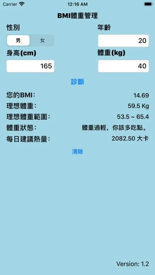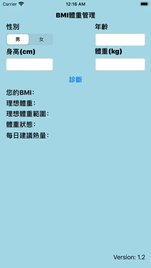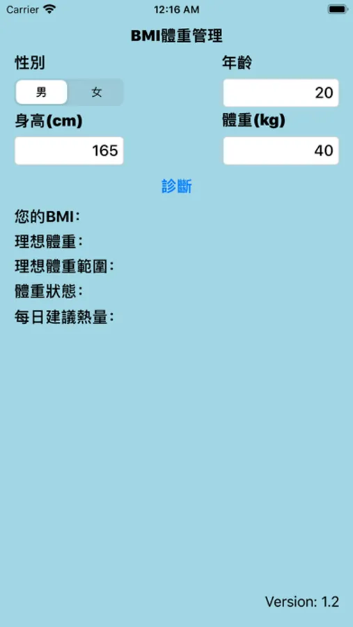 一個簡易的BMI體重管理應用程式,輸入您的身高、體重、性別與年齡,計算出您的身體質量指數BMI、您的標準體重與建議體重範圍,並告訴您要達到標準體重的每日所需熱量標準。