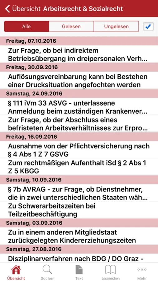 Von A wie Arbeitsrecht bis Z wie Zivilrecht erhalten Sie mit wenigen Klicks Leitsätze zu allen relevanten Entscheidungen der Höchstgerichte (OGH, VwGH, VfGH) und der Verwaltungsgerichte. Statt dem Durchackern langer Urteilstexte informieren Sie sich rasch über die Quintessenz aktueller Judikatur!