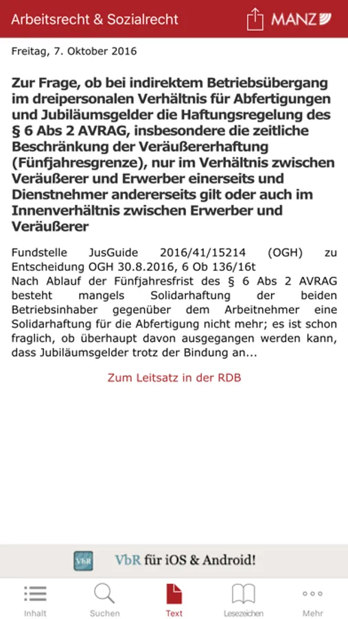 Zusatzservice für Abonnenten der RDB Rechtsdatenbank: Kunden der RDB Rechtsdatenbank (www.rdb.at) haben mittels Verlinkung einfachen Zugang zum Volltext des Leitsatzes.