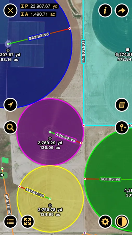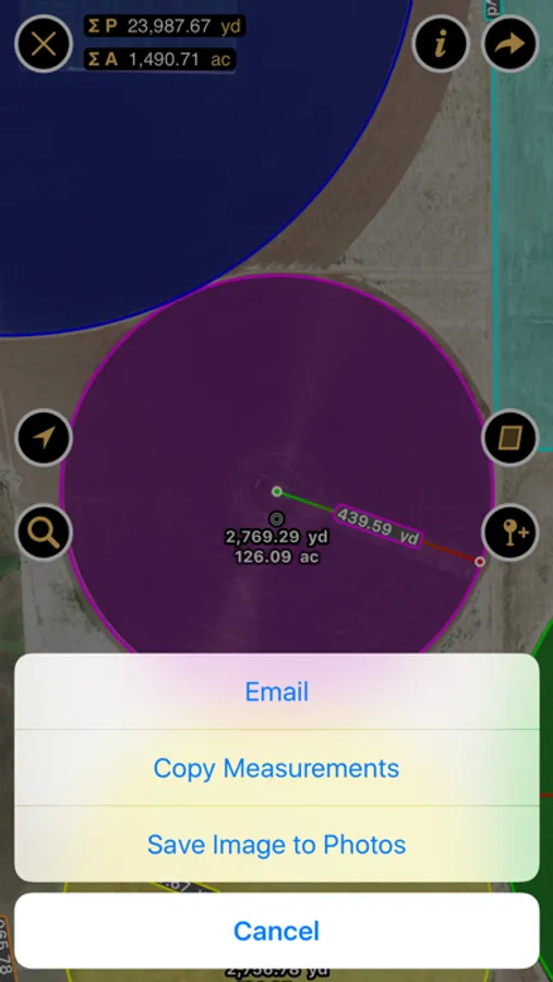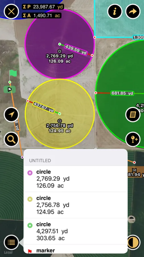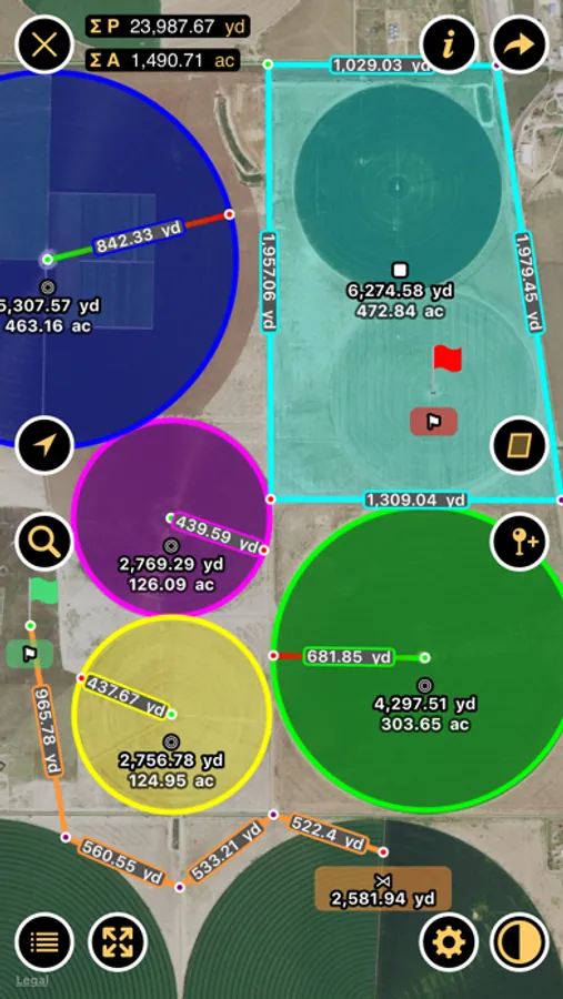 Measure fields, circular regions, paths and perimeters. Add markers to pinpoint locations.