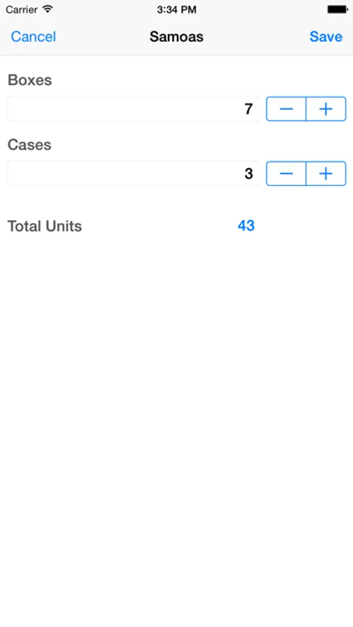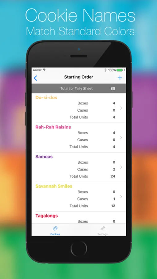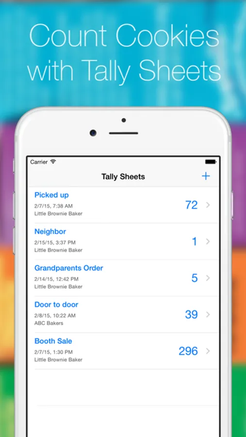 Tally sheets let you count each of the cookies based on boxes and cases. Your total for the tally sheets is shown at the top. Either use the buttons to add or remove cookies or type the number directly into the text field. Deleting tally sheets or cookies is simple, just swipe left and click delete.