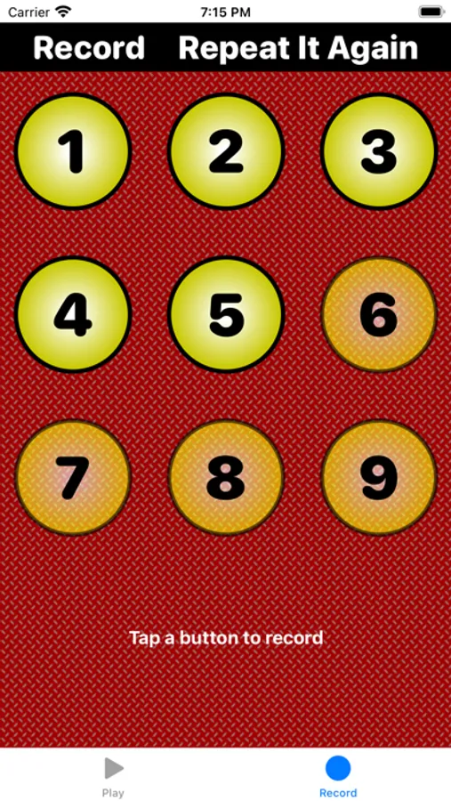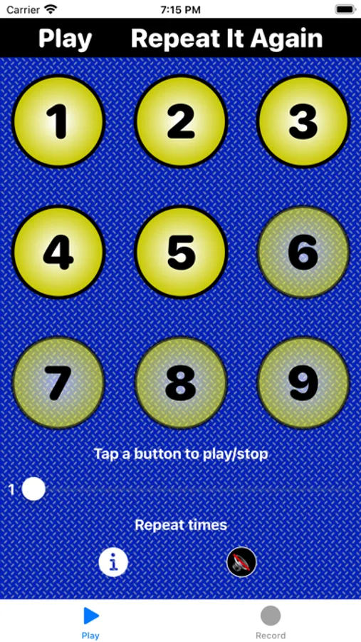 • Play tab: Play recordings the selected number of times. Tap to start, tap again to stop. Bright buttons have been recorded. Dim buttons have not been recorded.