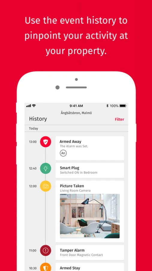Take control of your alarm status. Smart notifications provide an overview when family members return home and move the alarm status between armed and disarmed.