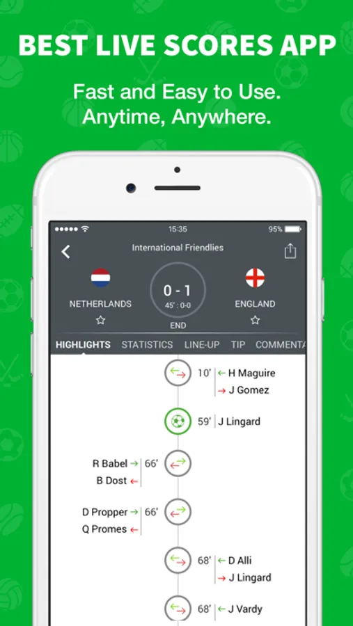 -Choice of alerts (goals, results, start of match) and of alert mode (vibration, audible, notification, etc.)