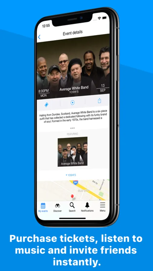 Just press play! Now eventseeker helps you discover new music with an instant play button that allows you to hear songs from bands and musicians with upcoming concerts. Sample music with iTunes or sign into your Spotify Premium account to listen to full songs.