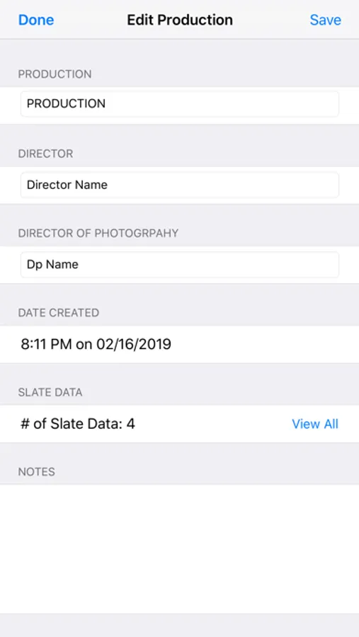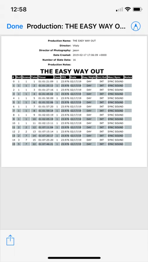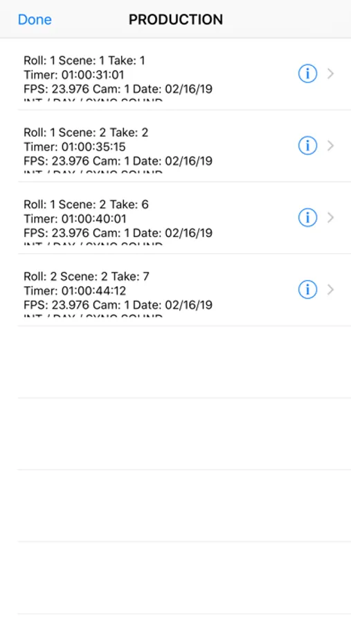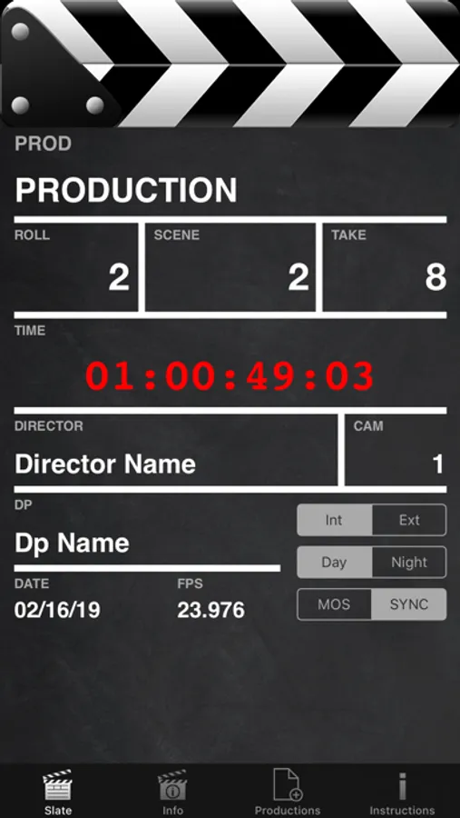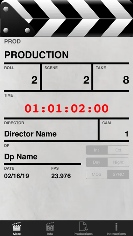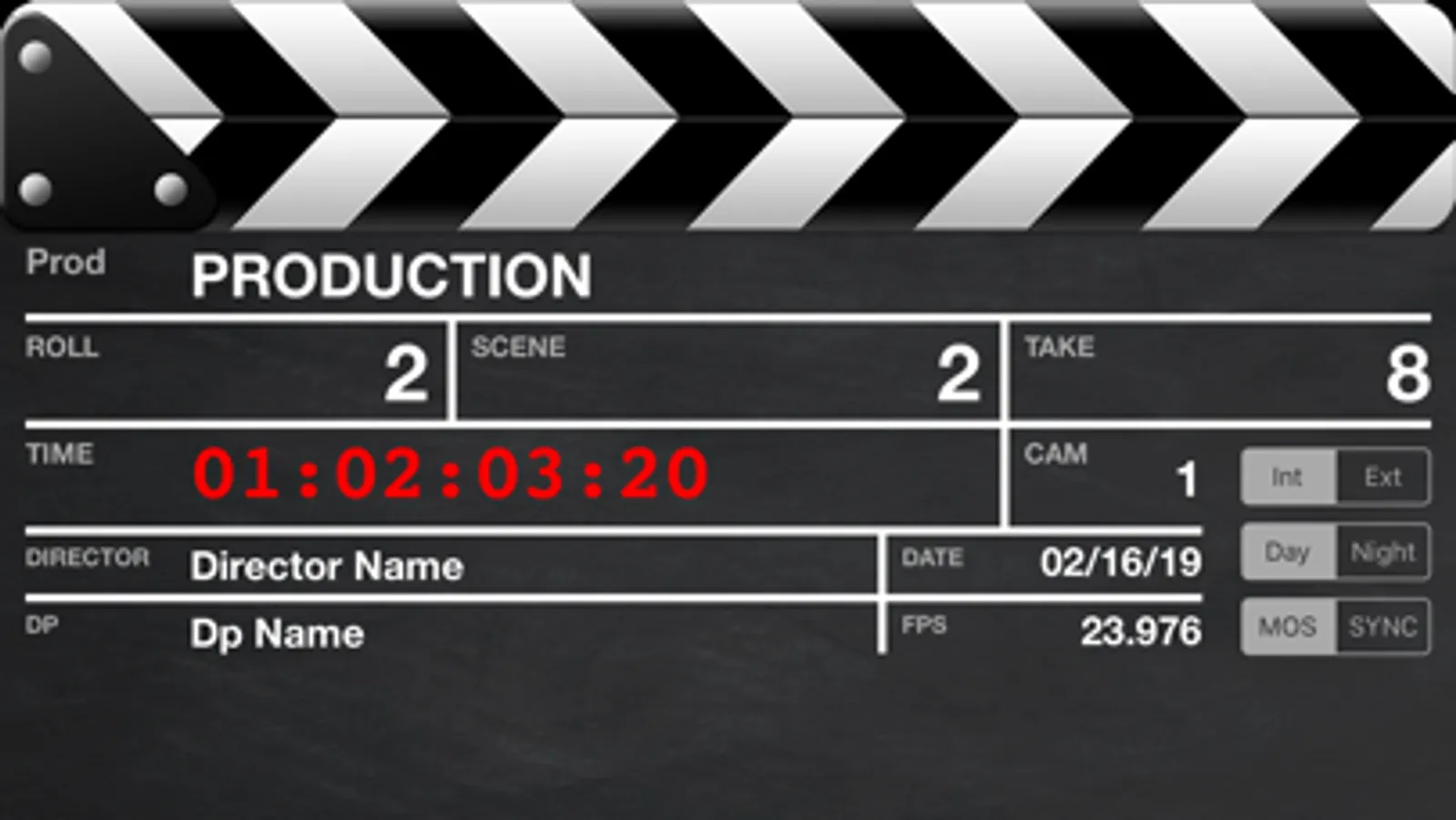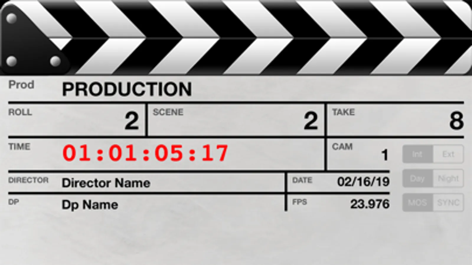 - All the expected fields on a physical slate: production name, roll, scene, take, director, dp, date, int/ext, day/night, mos/sync, fps, cam