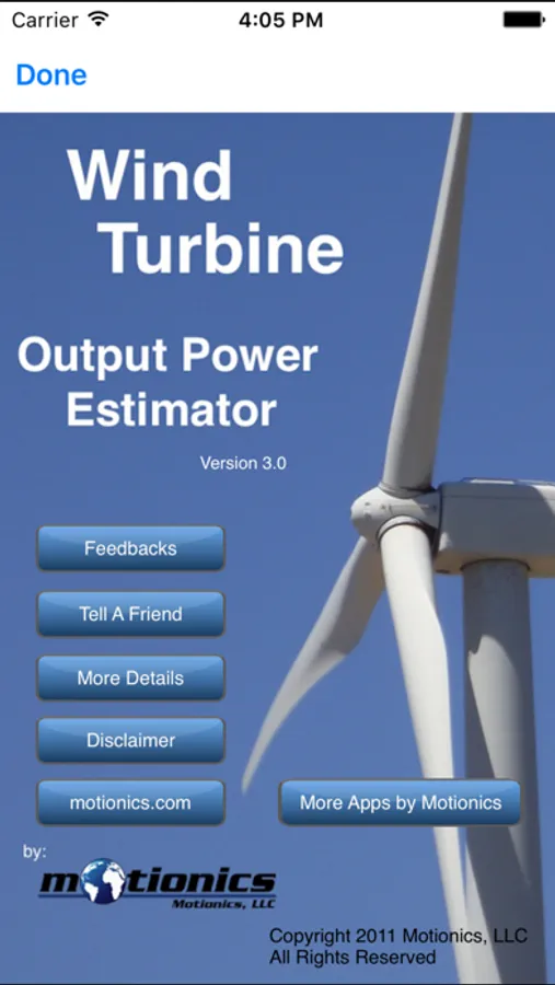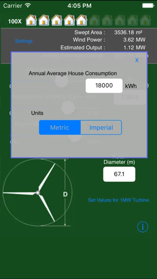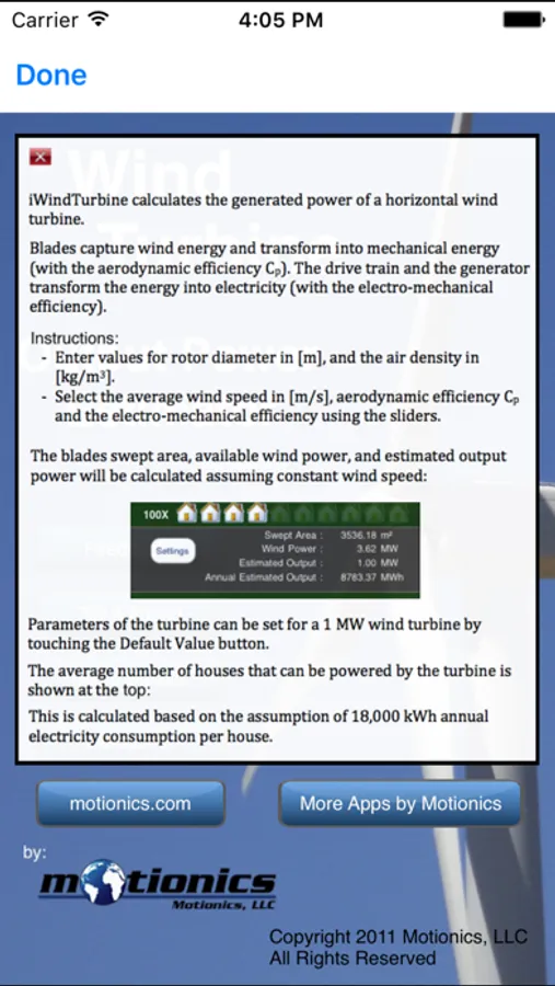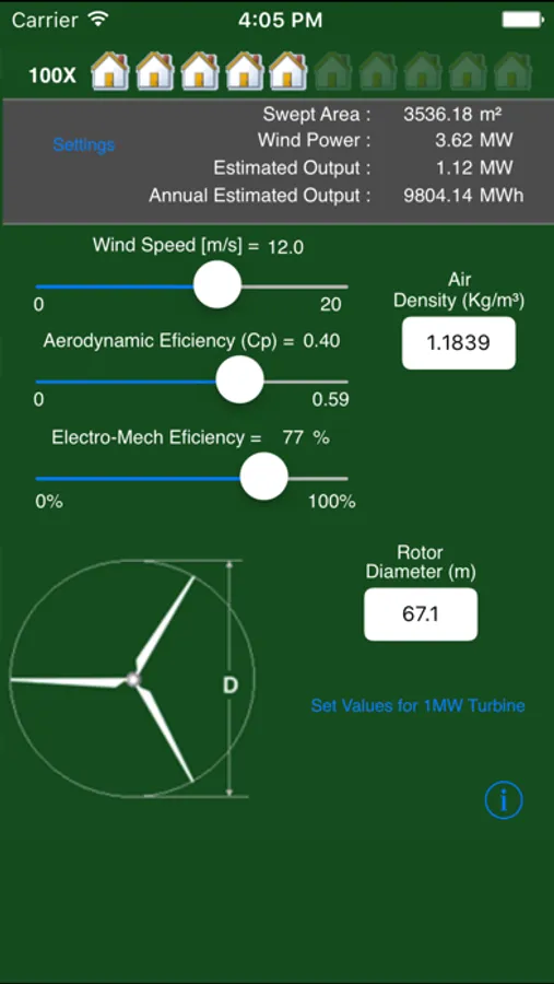 iWindTurbine calculates the electricity power generated by horizontal axis wind turbines. Enter the rotor diameter, air density, wind speed, aerodynamic efficiency and electro-mechanical efficiency of the turbine and iWindTurbine calculates the generating electricity power and the number of houses that can be powered with this turbine.