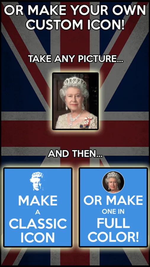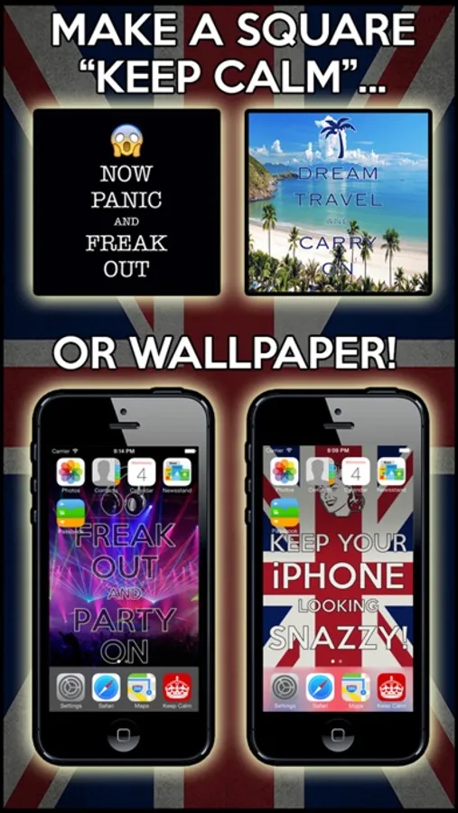 Keep Calm and Carry On for iOS makes it easy to customise your own unique variation of this classic. Amuse and impress your friends with your sparkling wit and imagination! (wit and imagination not included in purchase price).