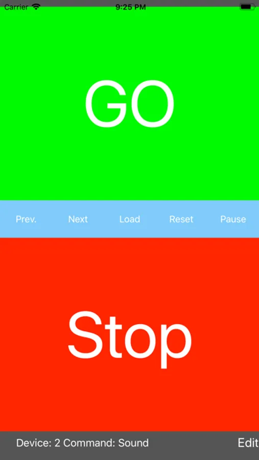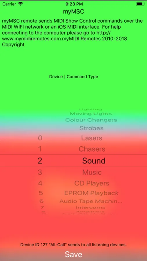 myMSC Remote sends MIDI Show Control commands (GO, Stop, Next, Prev., Pause, and Reset) to the selected device number.