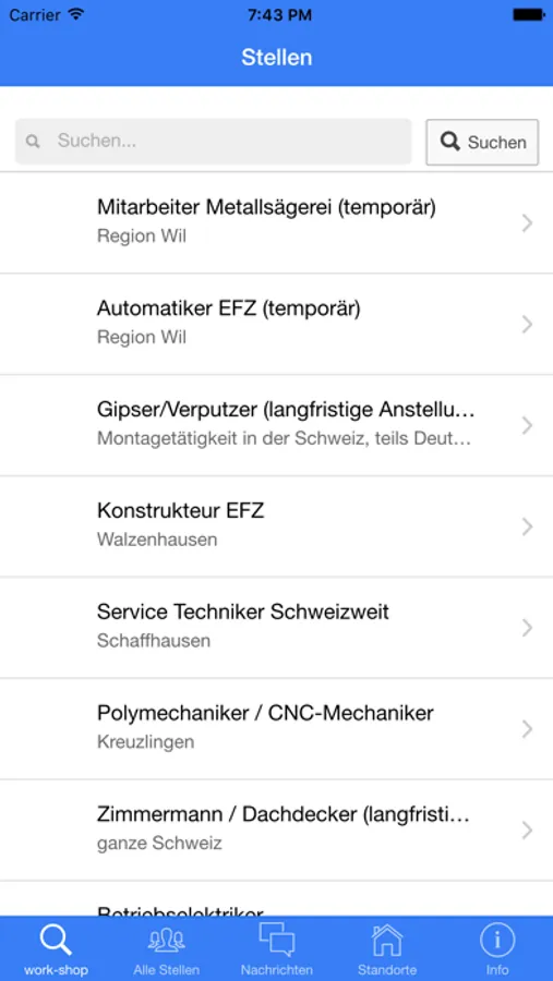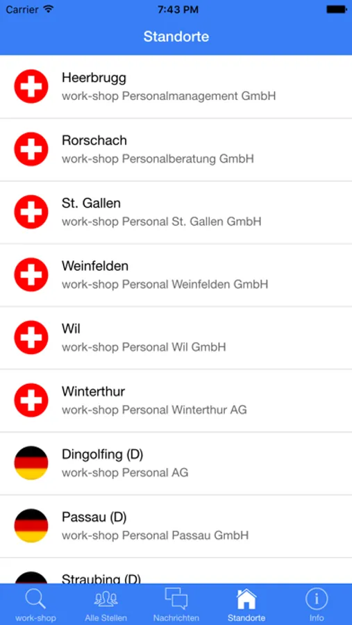 Mit dem dichtesten Niederlassungsnetz in der Ostschweiz (Heerbrugg, Rorschach, St. Gallen, Weinfelden, Wil und Winterthur) und Niederlassungen in Bayern (Dingolfing und Passau), pflegen wir mit über 20 Personalberatern einen intensiven Kontakt zu Arbeitgebern. Das App ermöglicht den Stellensuchenden jederzeit auf die aktuellen Stellen der work-shop Niederlassungen zuzugreifen und weitere Informationen abzurufen. Mit unserem Push-Service können wir Sie über wichtige Ereignisse in der Job-Welt sofort benachrichtigen.
