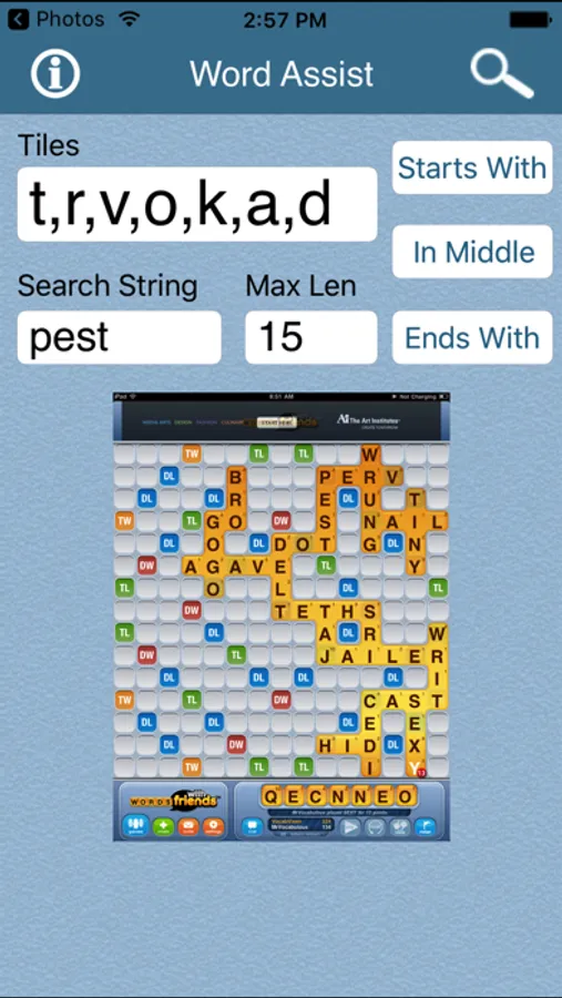 On the Home screen of Word Assist, you can enter your letter tiles, then enter your search string, a maximum length for the word, and click a button to look for the search string at the start of the word, the end of the word, or anywhere in the middle of the word. Example, say your tiles are z,h,o,r,t,e,u and there is a word on your game board 'back'. You could enter 'back' as the search term, with a max len of 15 and click In Middle, and you would get results such as 'backhoe' worth 19 points or 'outback' worth 18 points. The results returned are all those words that can be made given the search term (tiles already on the board) and your own letter tiles.