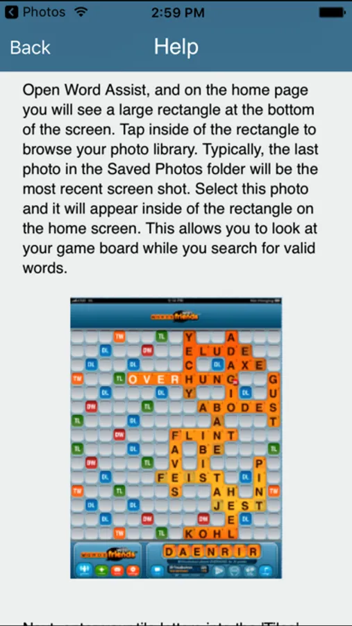 Word Assist eliminates the tedium of looking through long word lists for valid words, without taking away the fun and challenge of playing the game!