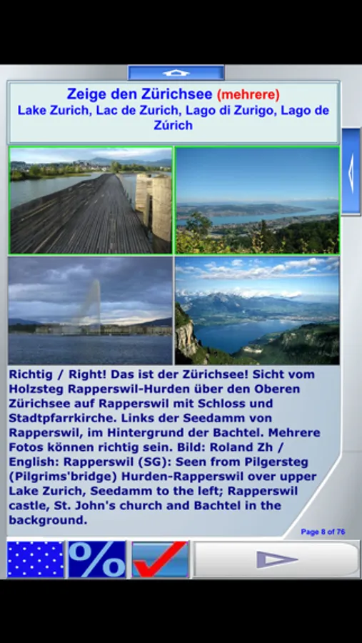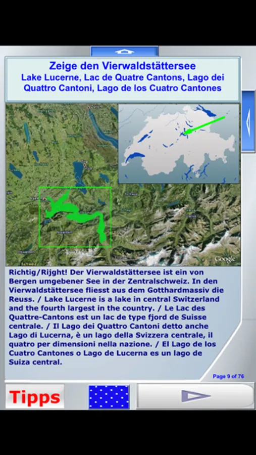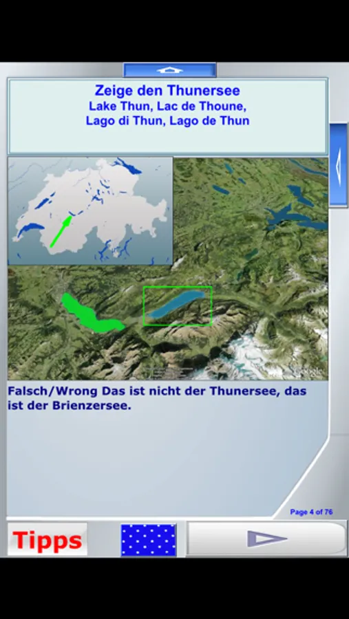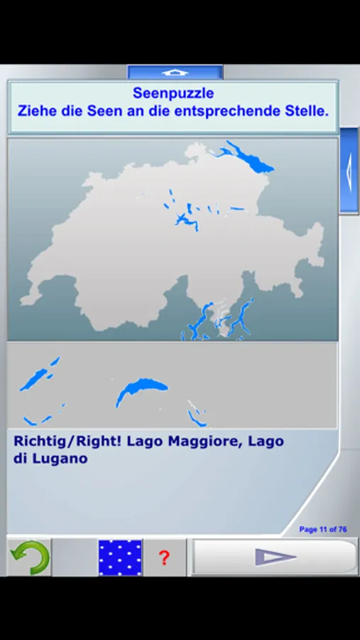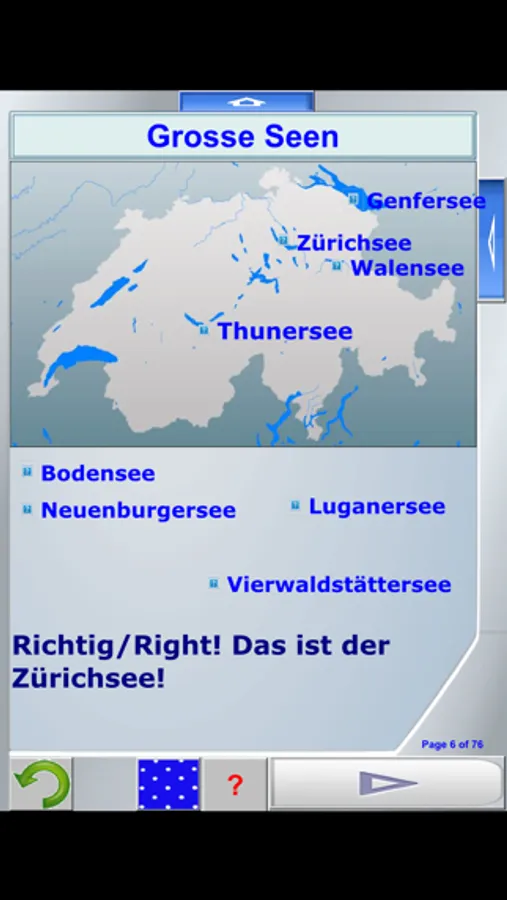 What's the name of this lake? You and other iPhone users give answers to such questions. With iLake quiz about Swiss lakes you will get to know in a playful way all about important Swiss lakes. Within a short time you will be an expert. The program shows map extracts with several lakes. Then you have to point directly on the desired lake. You will get immediately a feedback with interesting additional information in German, English, French, Italian and Spanish. If you have made a mistake you will get a detailed explanation on what's wrong and what the correct name of the lake is. Additionally an overview map is shown. If you click on 'Tips', you will get solutions and hints which you can use later. Another task is to choose one out of four postcards, each of them showing a lake. You will have to find the correct one, sometimes several are correct. Many questions you can answer by logical reasoning. Here you will also get a detailed feedback. Sometimes you will have to write an answer. Brand new on the App Store are questions where you can place e.g. different lakes on the right place on a map. New, there are also questions where you have to place labels or pictures on the right place with your finger. Thereby, each move is evaluated. At the end you will get an evaluation with your score (points or percent). You will also get a certificate. Who knows best about the lakes?