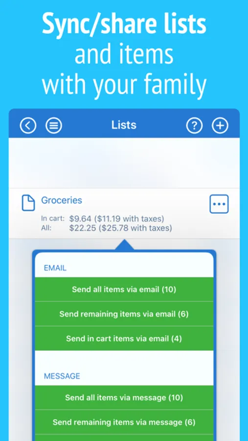 ● Share and synchronize your lists on multiple devices by enabling the sync. Or send your lists via email, WhatsApp, SMS or iMessage.