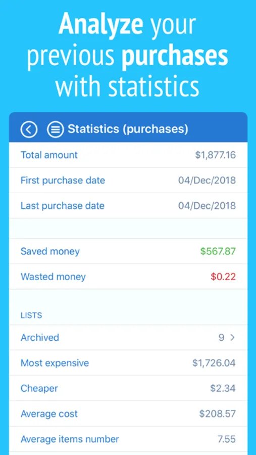 ● Archive your lists to reuse them and to see statistics about your purchases (for example you can identify cheaper and most expensive stores, overall and grouped by aisles).