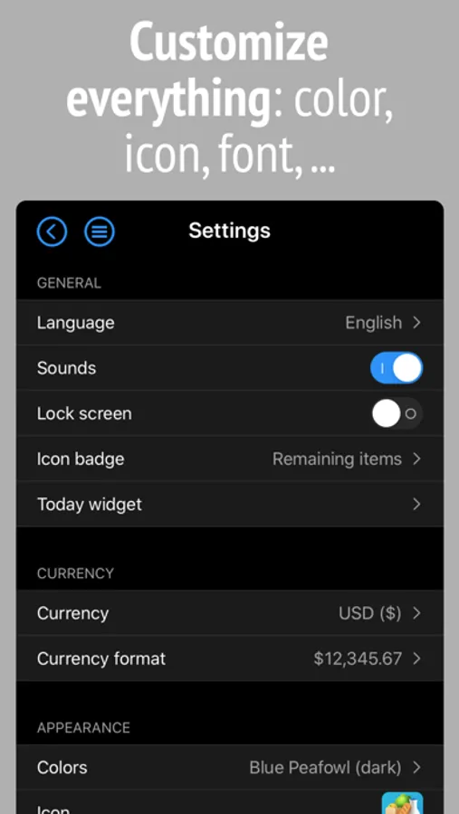 ● Customize IntelliList by choosing among 46 color templates, 22 different icons and 20 fonts.