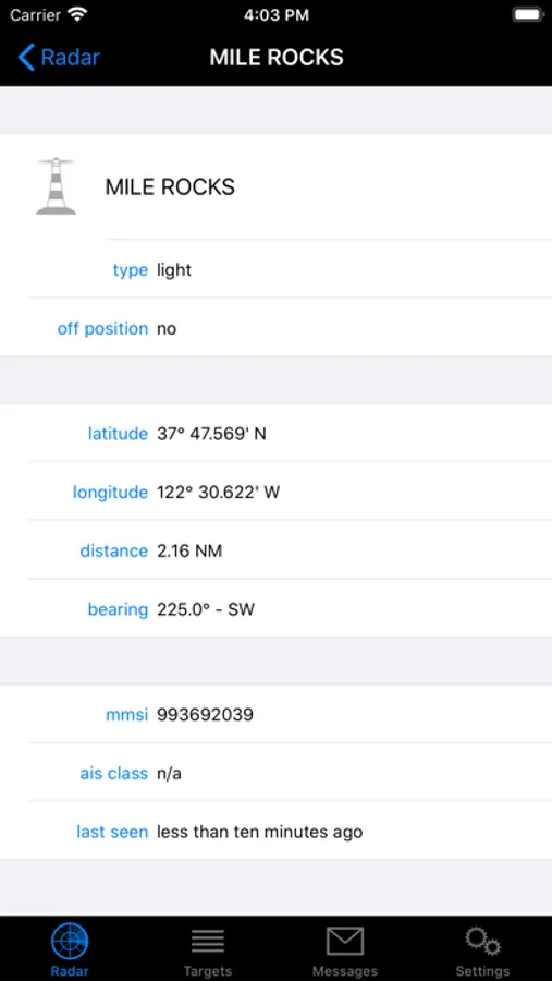 AIS Radar displays AIS (Automatic Identification System) data received from marine AIS transponders/receivers such as the ExNC 101, Weatherdock easyAIS or Digital Yacht, over a WiFi network. For AIS devices without built-in WiFi support, an external serial-to-WiFi adapter such as the SEAMate1A® Lite, the Brookhouse iMux, the Roving Networks RN-370 or the Digi Connect® Wi-SP can be used. Alternatively, the application can display AIS data received from public internet AIS feeds such as the San Francisco Exploratorium.