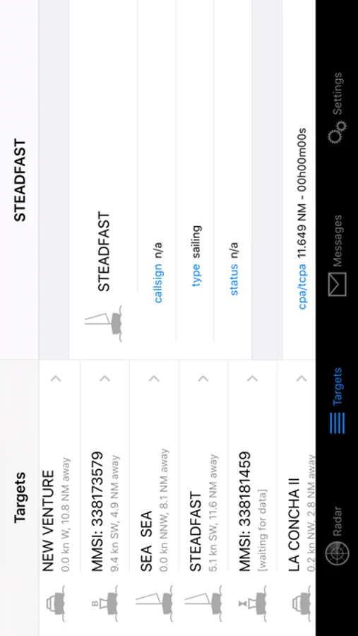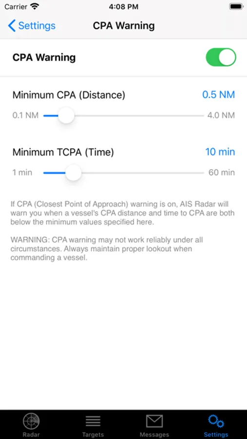 * CPA/TCPA warning: The app will warn if the CPA (distance) or TCPA (in minutes) of another vessel is below a specified minimum.