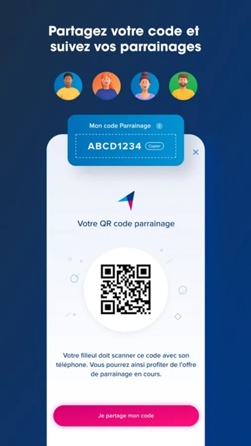• Retrouver votre code parrainage, le partager facilement et suivre vos parrainages en cours