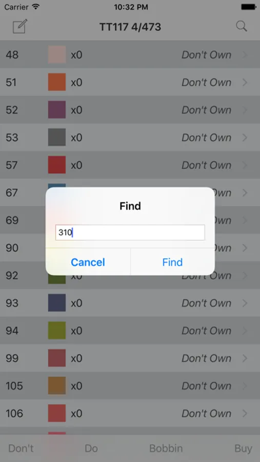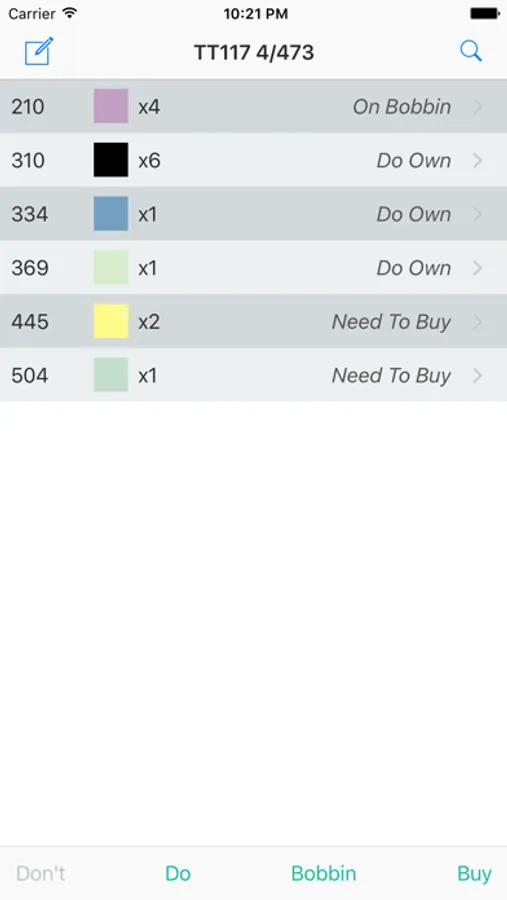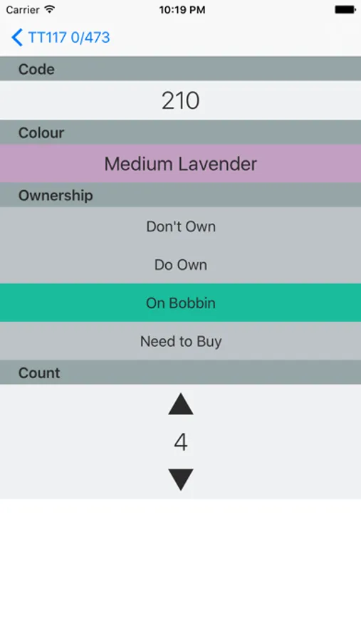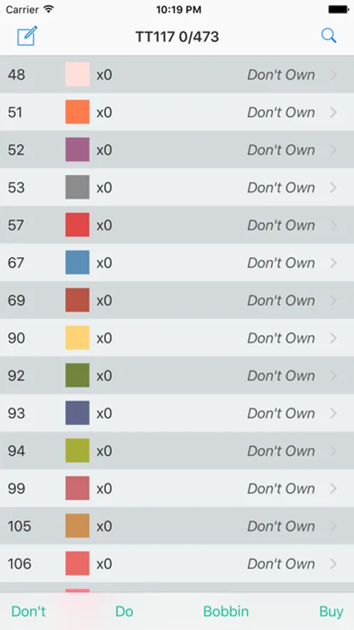 Thread Tracker 117 is a simple application designed to help you keep track of your DMC Art 117 Threads, it features all 488 colours in the Article 117 range + 36 417 varirgated, including the new Oct 2013 colours. The application allows you to set 'ownership status' of 'Don't own, Do own, On Bobbin and Need to Buy' per thread. Each thread is presented sorted by Code, with the ability to view a detail page which tells you the number, the colour name, a sample of the colour, view and modify the 'ownership status' and view and adjust the amount you own/need to buy. 4 buttons down the bottom of the application allow you to easily filter out/in threads based upon 'ownership status', allowing you to view only the ones you need to buy, or own easily. A search feature allows you to find threads by their Code.