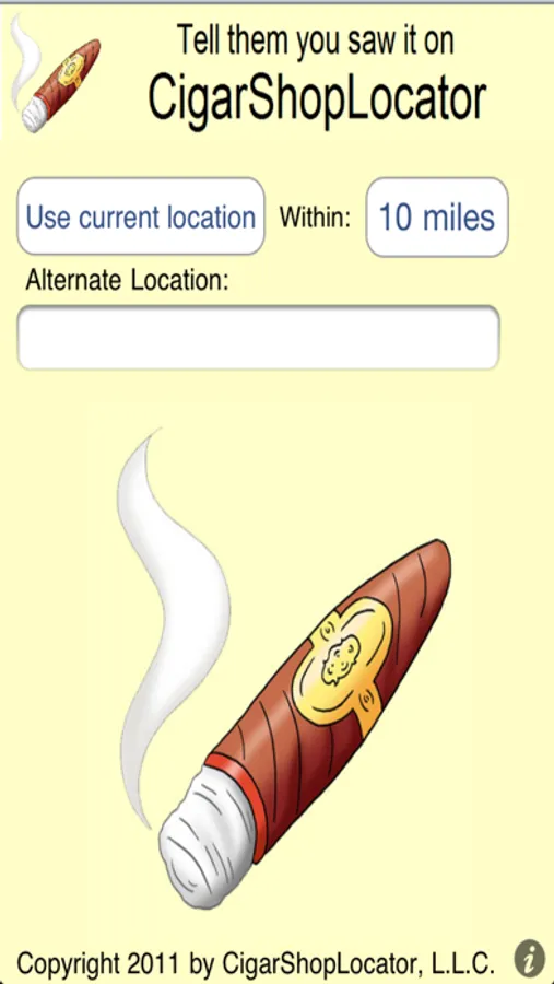 The CigarShopLocator App will find cigar shops that are near you or near a location of your choice. Basic information, how far you are from the shop, name, address and phone number will be listed.