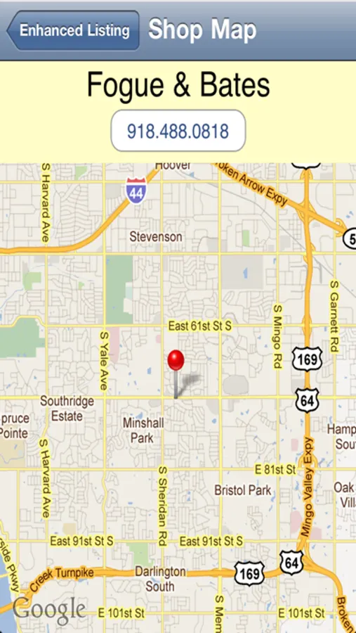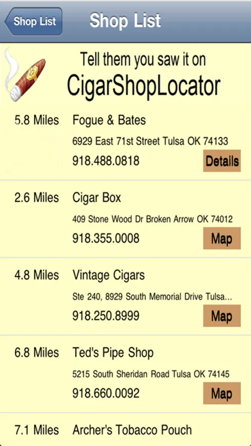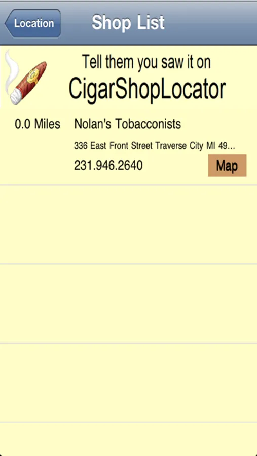 If you touch on the Cigar Shop’s "Map" button, it will launch Google Maps to pinpoint the location.