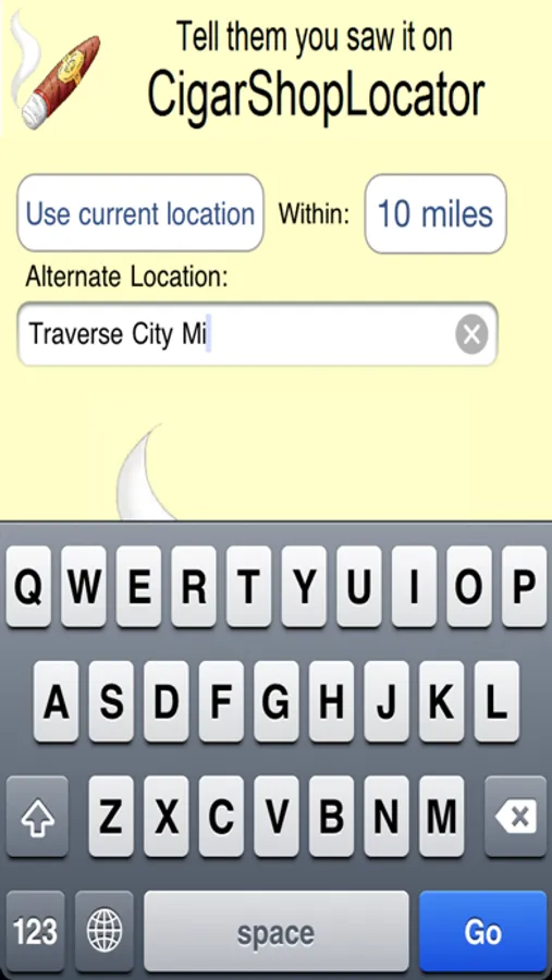 If you type an "Alternate Location" in the text box just below the Alternate Location text, the system will use that as your starting point for creating a list of Cigar Shops nearest to that location. Use the “GO” button on the keyboard to display the list.