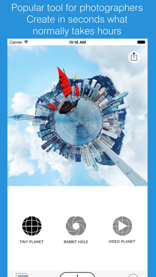 No need for hours in Photoshop or After Effects; Tiny Planet Photos helps you create this amazing effect with one tap in an instant.