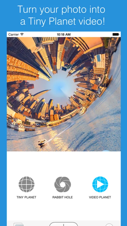 • Turn your photo into a Tiny Planet in one tap or invert the effect to make a Rabbit Hole.