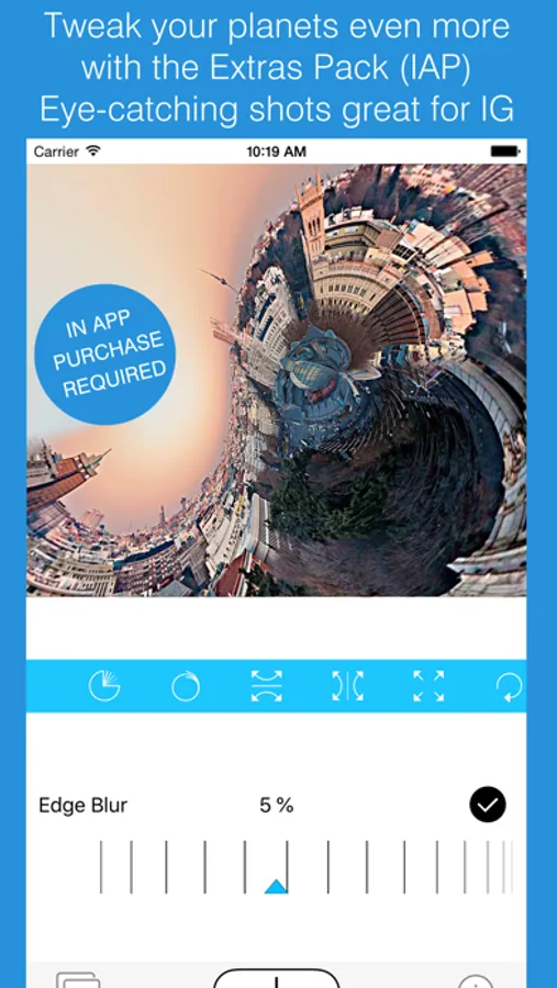 • Live Editing Tools to tweak your Tiny Planet to perfection: Edge Blur, Edge Alignment, amount of Warp, Zoom, Rotation, Move your planet up/down and left/right, Aspect Ratio.