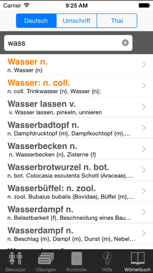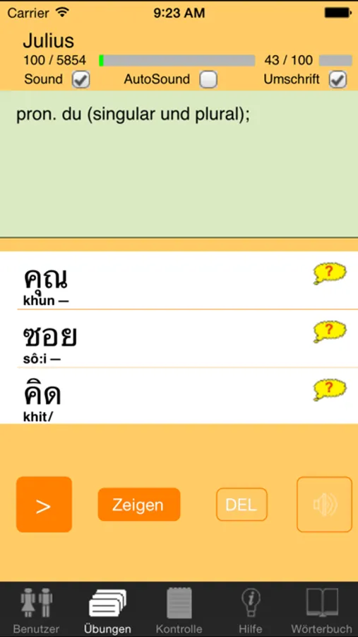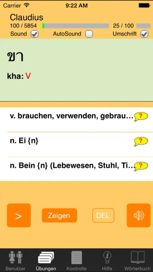 * Ein Wörterbuch ist integriert, das alle Thai-Wörter aus dem Trainer mitsamt den deutschen Übersetzungen kennt. Weil das definitiv die wichtigsten Thai-Wörter sind, können sie selbst dann, wenn sie noch nicht gelernt worden sind, schnell gefunden und verwendet werden.