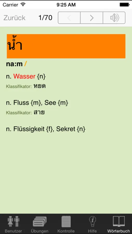 * Alle Thai-Wörter sind vertont und damit beliebig oft anhörbar. Gut verständliche Studio-Aufnahmen von einem Thai-Sprecher lassen Sie alle gelernten Wörter richtig aussprechen und trainieren gleichzeitig das Verstehen von gesprochenem Thai.
