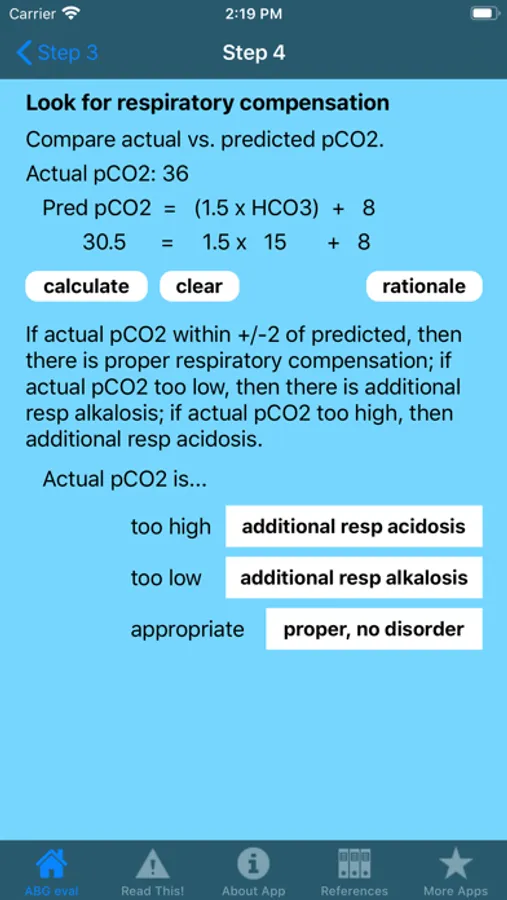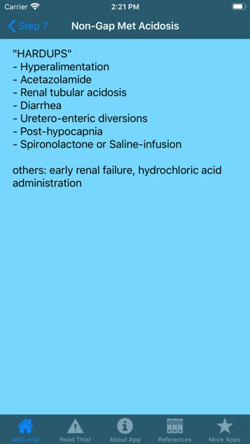 ABG Acid-Base eval walks a clinician through a stepwise approach to analyse ABG's and electrolytes in order to arrive at acid-base disorders and diagnostic ideas about ill patients. It is based mainly upon a worksheet developed by Dr. Erik Rupard from the medical literature. This tool not only yields answers, but just as importantly teaches the stepwise thinking process and the necessary concepts along the way. A clinician or learner will wind up with good information that assists patient care and should wind up a little smarter and more able to do it with less assistance the next time. It is a great support for those of us clinicians who use these tests only occasionally and don't have it memorized. The differential diagnoses include the classic mnemonics like MUDPILERS, CHAMPS, CLEVER PD, and HARDUPS, with explanations and examples.
