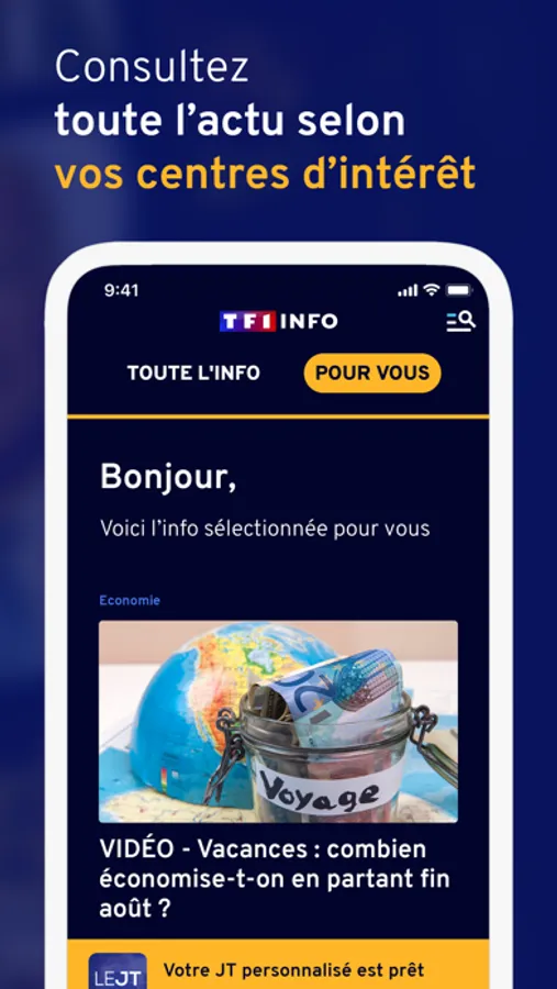• Votre JT personnalisé : Regardez votre JT (journal télévisé) personnalisé spécialement fabriqué pour vous en fonction de vos centres d’intérêts. Une simple création de compte est nécessaire pour en profiter.