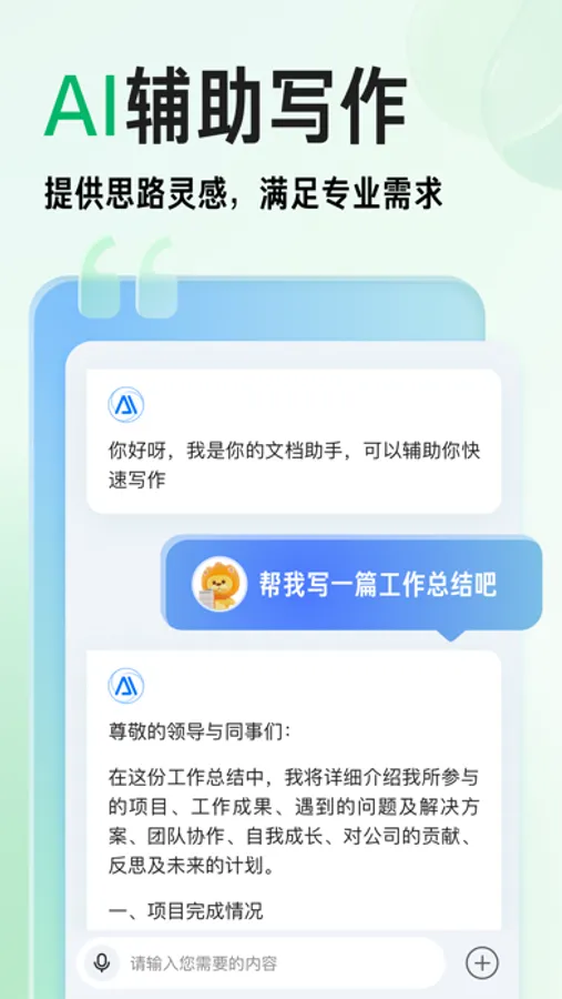 可根据输入的主题及内容要求,生成格式标准、内容个性化的范文,同时支持将范文导出为标准文档格式,满足你多种学习、工作场景中的写作需求。