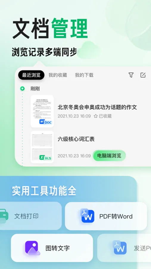 支持word、PPT等文档格式转换,扫描查词、英语翻译、语音速记、图片转文字、文档导入、文档发送、文档打印、文档导出长图,助你随时随地,高效工作学习;