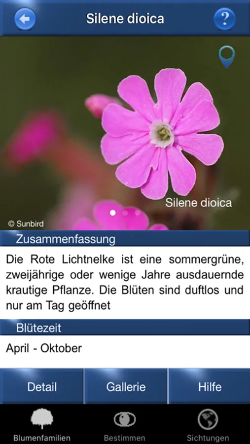 Er beinhaltet die 230 häufigsten Wildblumenarten der Schweiz, Österreichs und der Alpenregion Deutschlands. Mit über 800 Naturfotos, GPS Lokalisierung, Listenfunktion und Quiz. Die App bietet eine intuitive Bedienbarkeit, die sich bewährt hat. SUNBIRD-Apps bieten eine übersichtliche und einfache Menueführung sowie hochqualitative Fotos für eine einfache und schnelle Identifikation.
