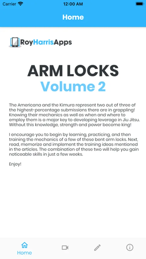 I designed this app to be a combination of thirty-five instructional videos and two very informative articles. The mix of these two will set you on a journey toward finishing bent arm locks more confidently & consistently in your training sessions and in competitions.