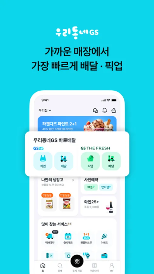 GS25 및 GS THE FRESH의 다양한 상품, 배달, 결제, 택배 등 여러가지 유용한 서비스 및 와인25플러스와 멤버십 혜택까지!