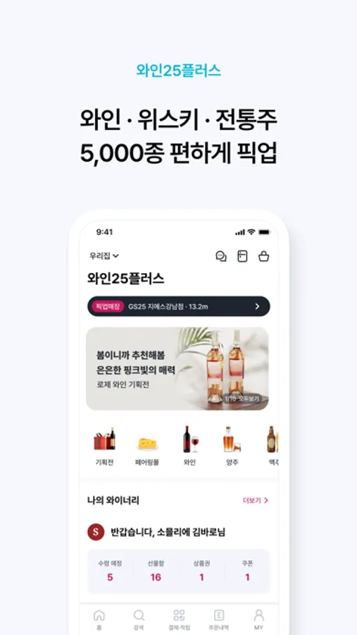 와인과 다양한 주류를 주문하고 원하는 매장에서 픽업할 수 있습니다.
