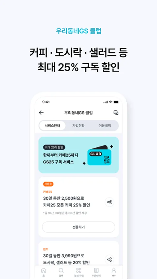 우리동네GS 클럽은 전국 GS25에서 도시락 등 Fresh Food 상품과 카페25 커피까지, 자주 구매하는 상품들을 정기로 결제하고 더 큰 할인혜택으로 만날 수 있는 서비스 입니다.