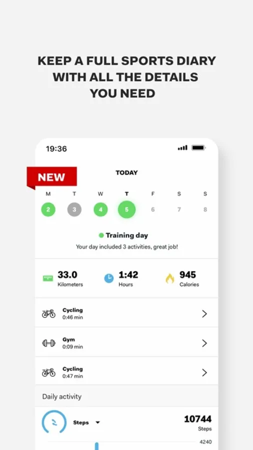 - Training diary, weekly, monthly, yearly summaries per activity type