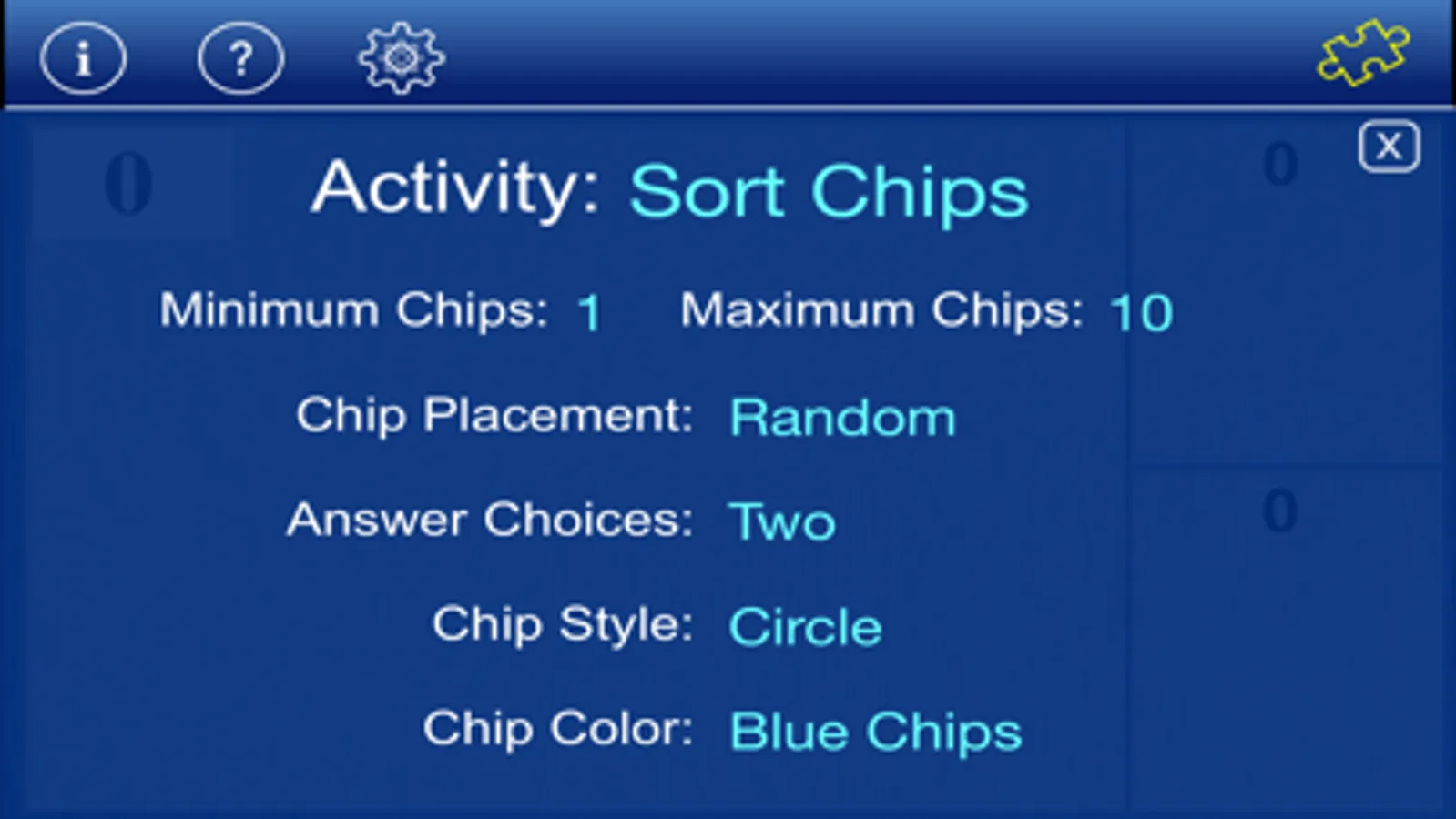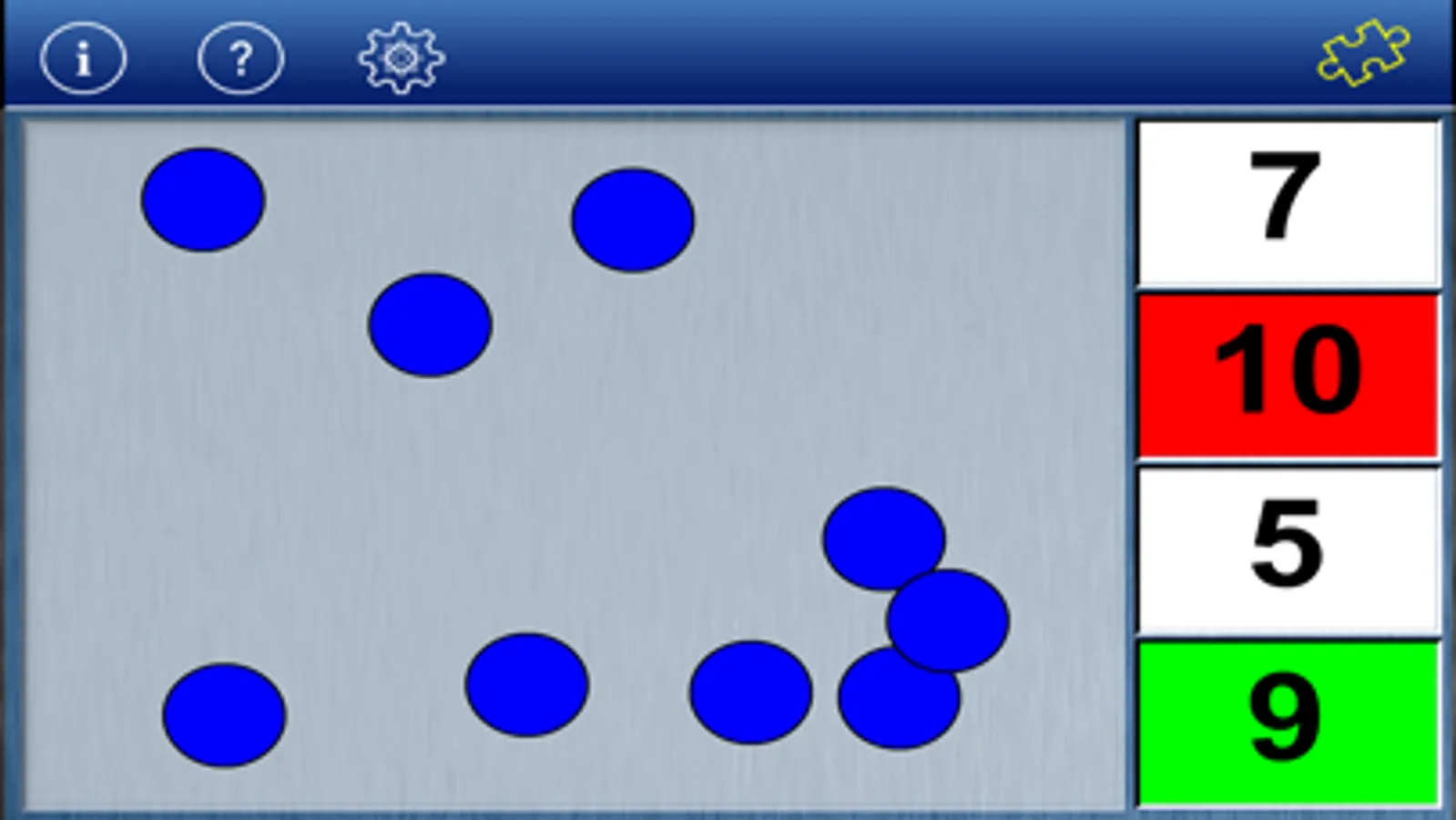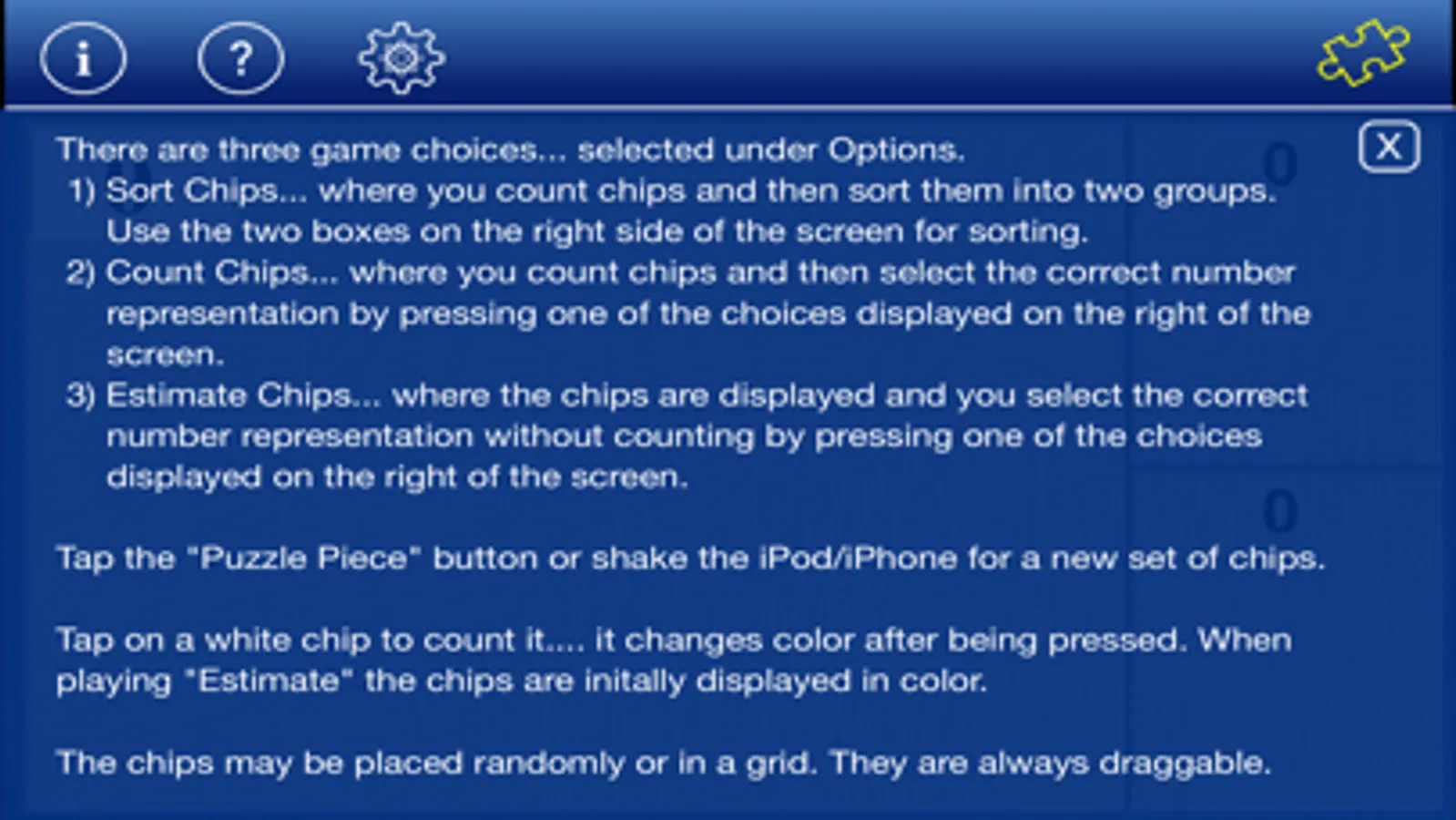 A very basic set of activities for children just beginning to learn about numbers. Using numbers up to 32, Count Sort helps children recognize that counting must be done in a “one-to-one” fashion. Options exist to limit the counting target to 10, 15, 20, 25, and 32 chips. The activities also develop early numeral recognition and early recognition of number “families.” The iPad version includes an option to display the chips in 10 Frames.