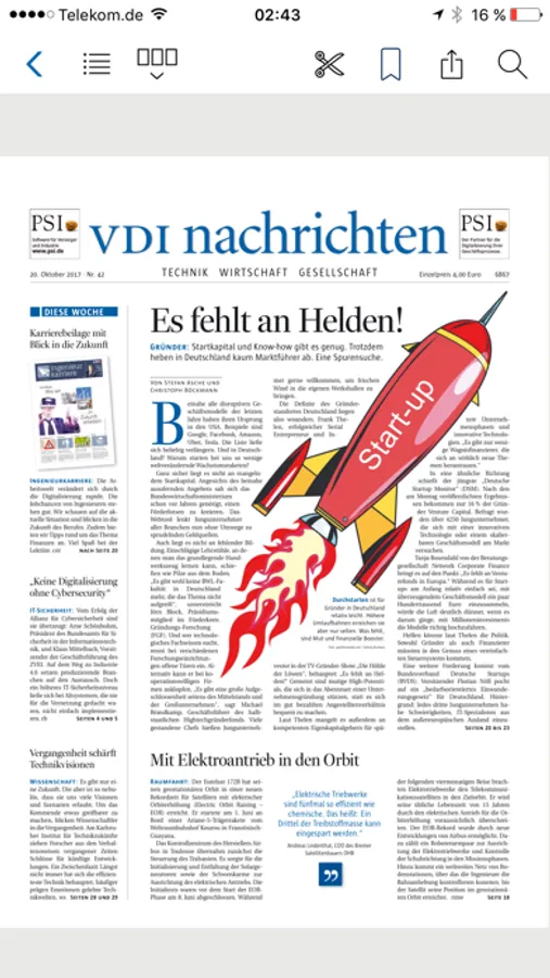VDI nachrichten berichtet über innovative Technologien, wirtschaftliche Rahmenbedingungen und gesellschaftliche Entwicklungen. Sie ist die Wissensbasis für alle, die technische Trends und deren Chancen und Risiken sicher einschätzen wollen.