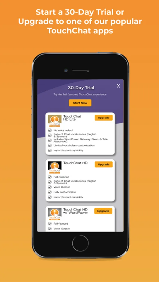 After your 30-day trial ends, you’ll have the option to purchase TouchChat HD w/WordPower®, TouchChat HD, or TouchChat HD Lite. If you don’t make a purchase, you’ll still have access to the WordPower96 English and Spanish lite-tech boards when your trial period ends.
