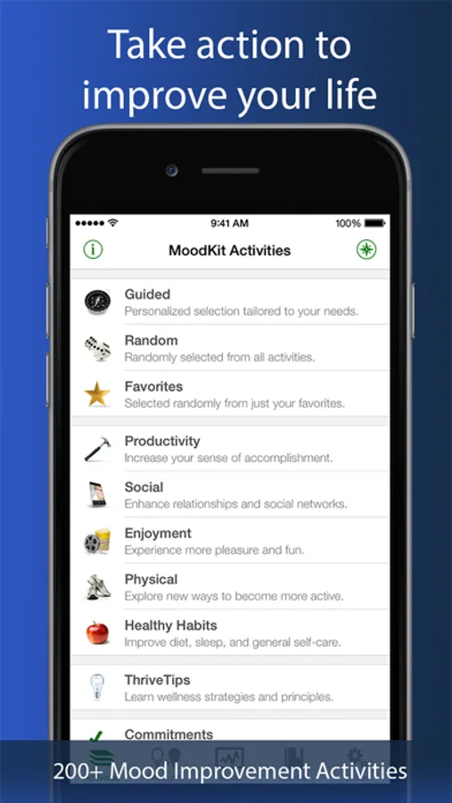 "If you are looking for a greater sense of optimism, an improved mood and a greater sense of control over your life, open up the MoodKit app." --Dennis Greenberger, Ph.D., Co-author of Mind Over Mood, Past President of the Academy of Cognitive Therapy