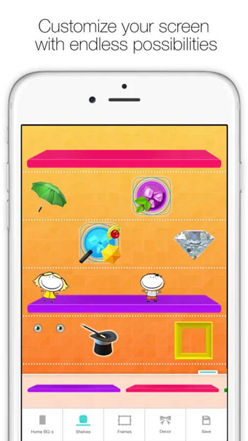 Personalize your iPhone home screen with cute Wallpapers, Icon frames, Shelves, Decorations and show to friends how cool and OUTSTANDING your iPhone looks! It’s like a photoshop for your home screens!